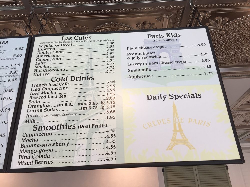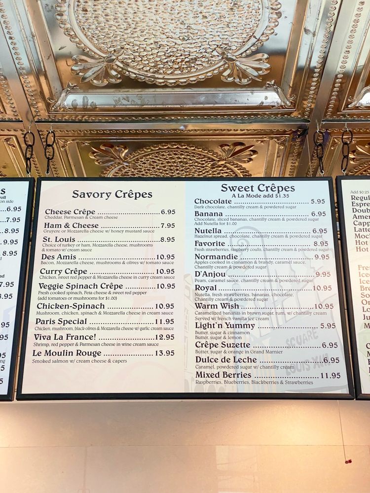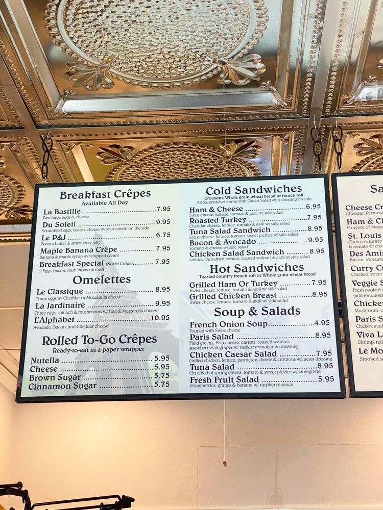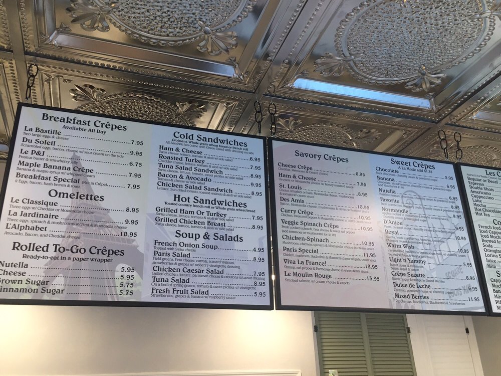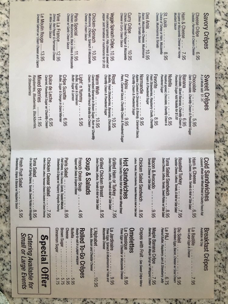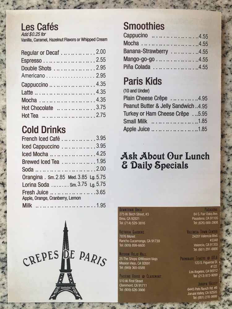 The charming Crepes De Paris offers a delightful menu with a variety of options for every mealtime. Located in Los Angeles, this cozy cafe provides an intimate setting perfect for a relaxing dining experience. From savory Omelettes like L'alphabet with avocado and bacon to sweet treats like Nutella Crepe with hazelnut spread, there's something for everyone. Customer reviews rave about the friendly service and delicious dishes like the chicken w/spinach & garlic cream sauce. While some note the challenge of finding parking, the quality of the food and the quaint French cafe ambiance make it a must-visit. Whether you're craving a hearty breakfast crepe or a light dessert, Crepes De Paris is sure to satisfy your cravings in a charming setting.